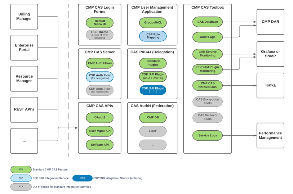 CSP Auth Flow (for delegation) | CMP CAS Server | CMP Provides default login flow only (see below) based on CMP User Database and CMP Login Screens. For CSP having its own process, CSP CAS Service flows have to be configured. | This is the main customization service for integration to external IAMs. |